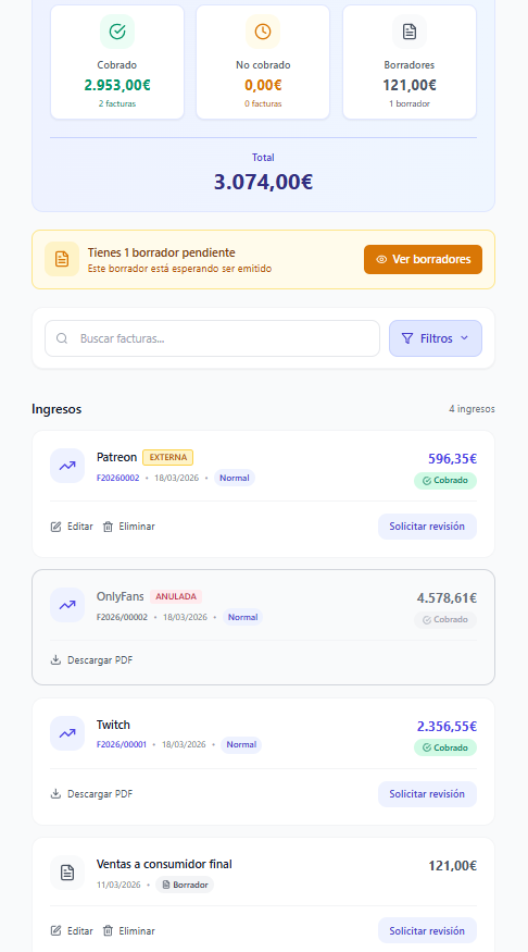Desde la entrada en vigor del sistema VeriFactu en España, los autónomos y creadores que utilicen un sistema informático de deberán emitir facturas verificables y que cumplan con la normativa de la ley antifraude que exige la Agencia tributaria, garantizando la no alteración de la información de las facturas una vez emitidas. Esto incluye a creadores que generan ingresos en plataformas como OnlyFans, Patreon, TikTok o Twitch.