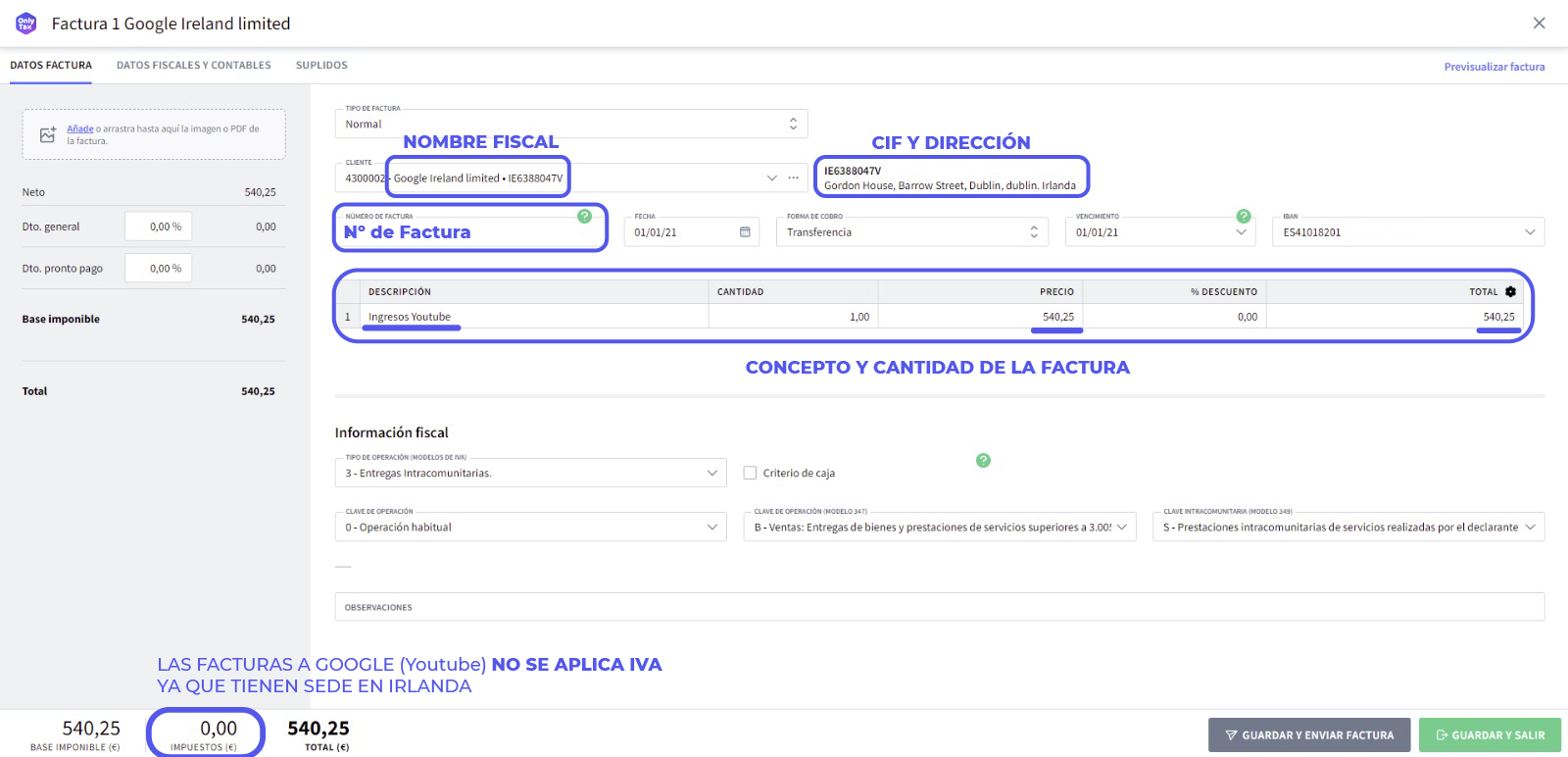 A continuación debemos añadir el número de factura que corresponda en tu caso (puede ser la primera o la décima 😅) y seguidamente añadir el concepto e importe de la factura, que en este caso según la monetización que aparece en la imagen de más arriba es de 540,25€. Ten en cuenta que Google tiene sede en Irlanda, por lo tanto a la factura no habrá que añadirle el 21% de IVA.